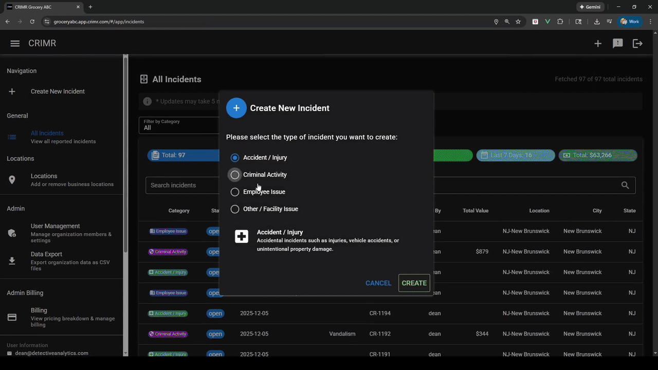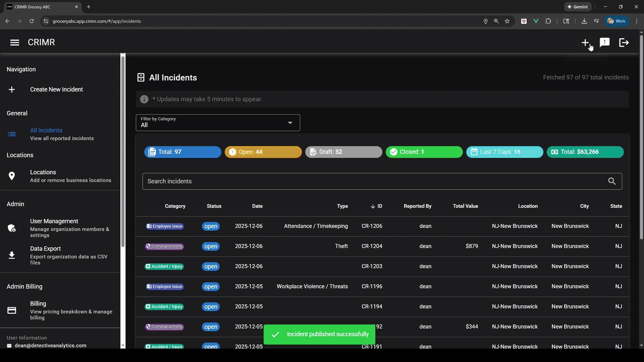 With CRIMR, you glance at the week and see a clean record: accidents logged with photos, internal issues time-stamped and documented, theft incidents captured with values and video links. If a lawyer, unemployment claim, or detective shows up, you already have organized, shareable facts ready to send to your insurance agent, HR, or investigators. For $19.99/month, you are not wondering which undocumented problem will come back to bite you — you already have the facts.